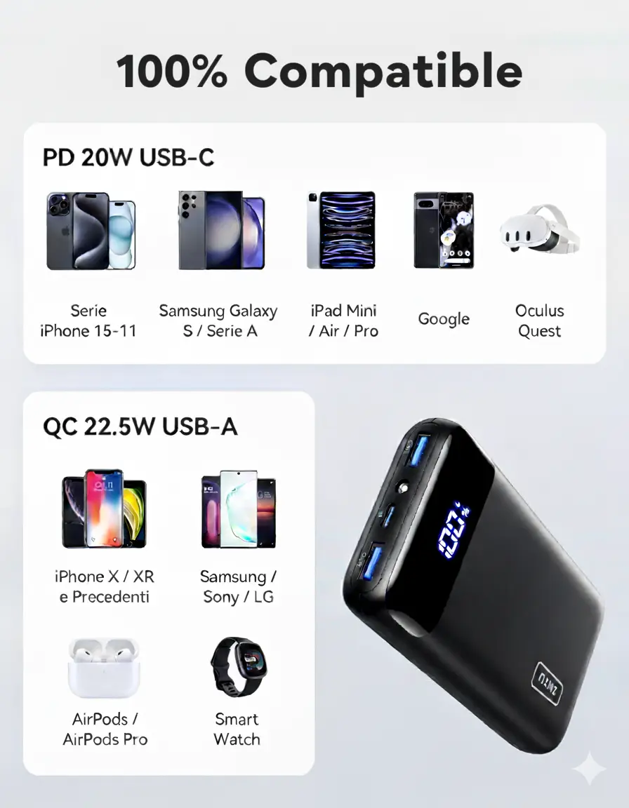 Contrairement à la plupart des batteries externes incapables de recharger les appareils peu puissants, INIU est compatible non seulement avec tous les téléphones et tablettes, mais aussi avec vos petits appareils (AirPods, écouteurs Bluetooth, trackers de fitness, montres intelligentes, etc.)
