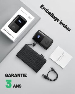 1x Batterie externe 10000mAh, 1x câble USB-C, 1x manuel d’utilisation, 1x pochette de voyage, garantie 2 ans à la pointe de l’industrie et assistance technique à vie.