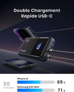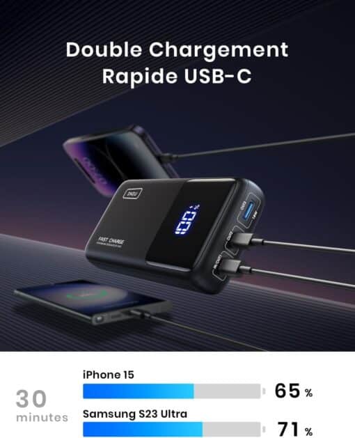 Le chargeur portable est très compact et léger, ce qui le rend facile à transporter dans mon sac à dos ou ma poche. Il est livré avec un câble USB-C, ce qui est pratique car c'est le même câble que j'utilise pour charger mon ordinateur portable. J'ai pu charger mon téléphone iPhone 13 Pro Max en un rien de temps grâce à la fonction de charge rapide de 22,5 W.