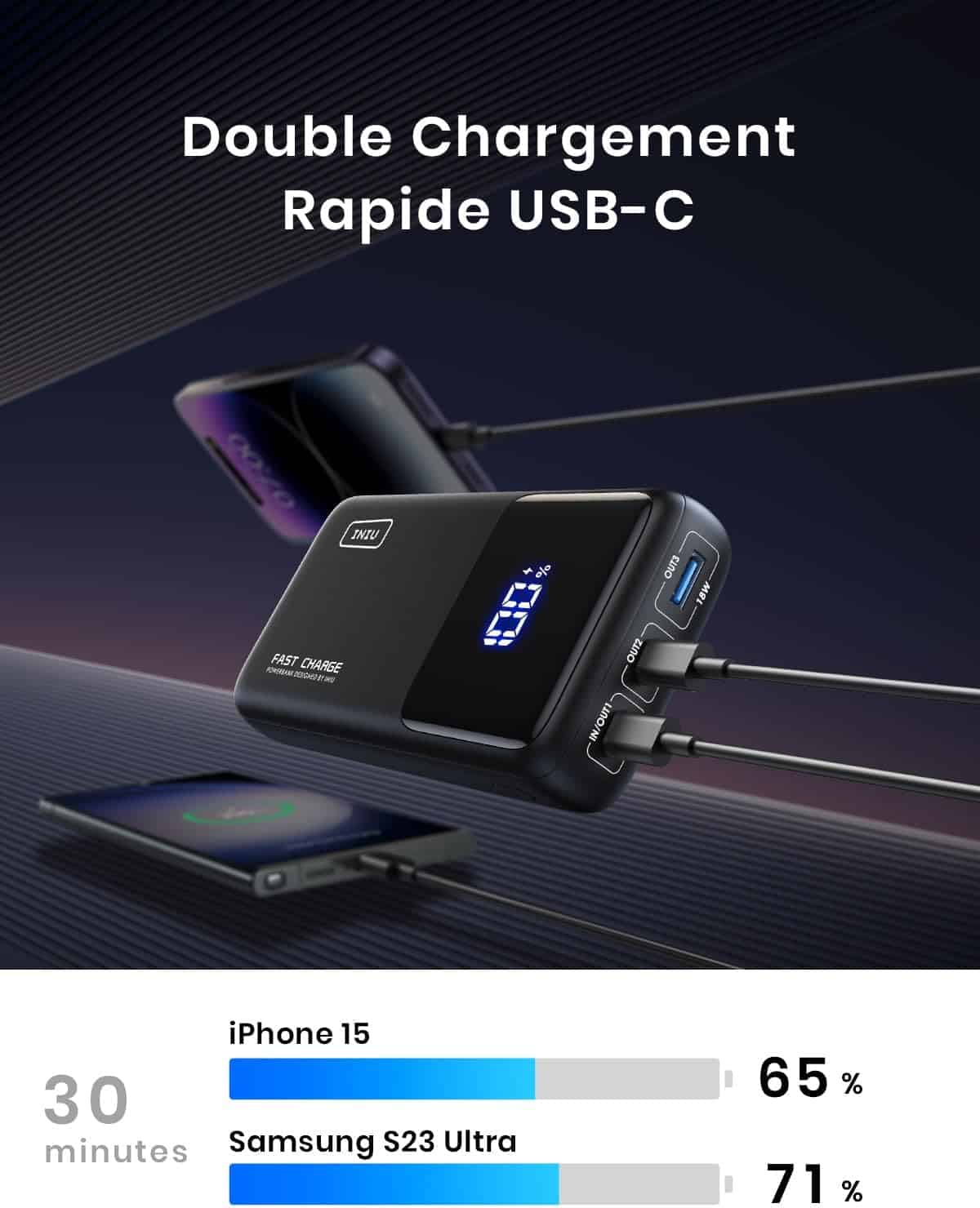 Le port USB-C IN&OUT alimente non seulement efficacement vos appareils via une sortie de 100W, mais recharge également rapidement le power bank lui-même avec une puissance d’entrée haute vitesse de 65W, rationalisant ainsi votre configuration de charge.