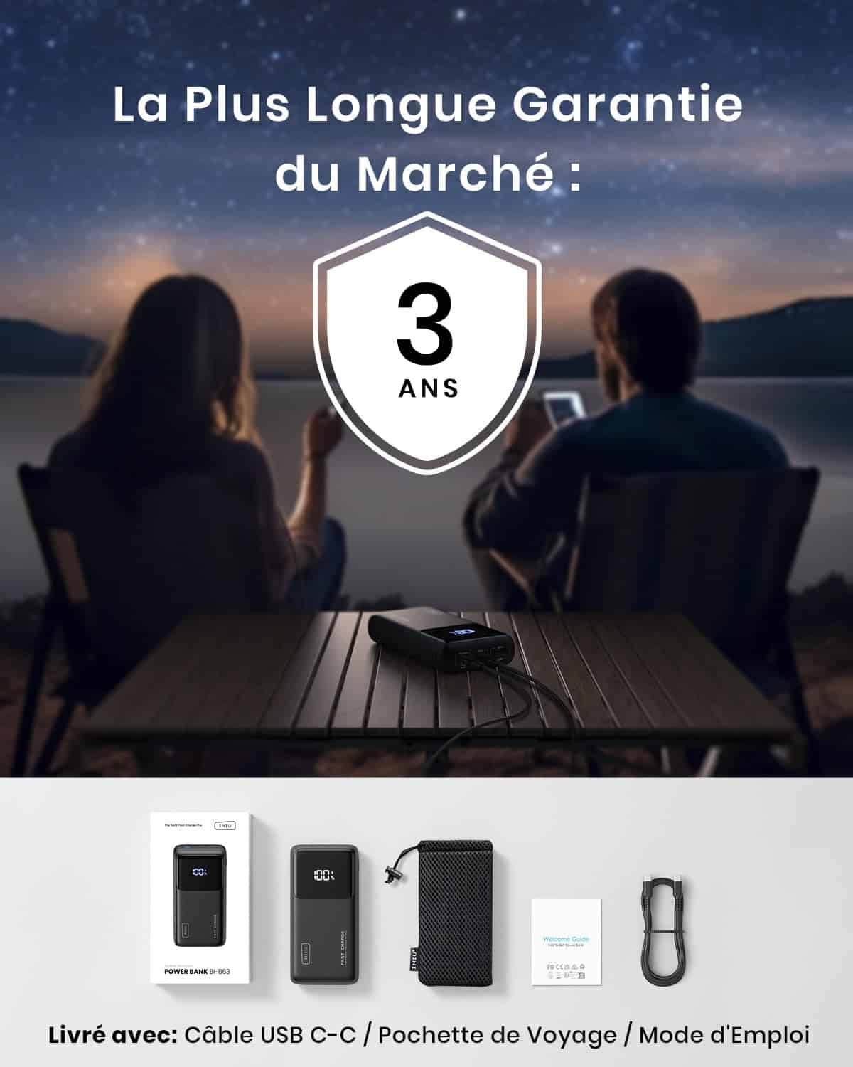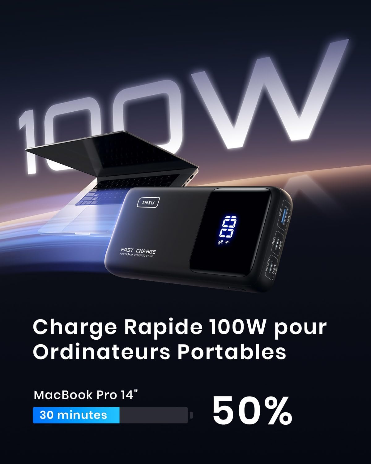 1x Power Bank INIU 100W, 1x câble USB-C vers USB-C (0,3m), 1x manuel d’utilisation, 1x pochette de voyage, garantie 2 ans à la pointe de l’industrie et support technique à vie.