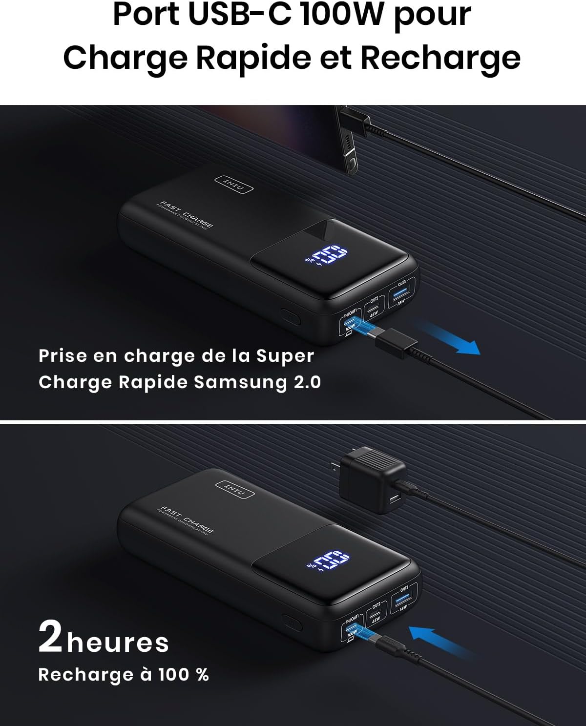 Élevez votre expérience de charge avec notre batterie externe de pointe. Optimisée pour fournir une puissance impressionnante de 100W, assurant une charge rapide comme l’éclair pour les ordinateurs portables phares, vous permettant de rester productif sans être attaché à une prise de courant.