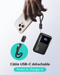 Le chargeur portable est très compact et léger, ce qui le rend facile à transporter dans mon sac à dos ou ma poche. Il est livré avec un câble USB-C, ce qui est pratique car c'est le même câble que j'utilise pour charger mon ordinateur portable. J'ai pu charger mon téléphone iPhone 13 Pro Max en un rien de temps grâce à la fonction de charge rapide de 22,5 W.