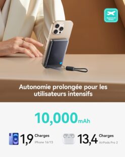 La capacité de 10000mAh approuvée par les compagnies aériennes offre 2 charges complètes pour votre iPhone 16 – bien supérieure à d’autres batteries de 5 000mAh qui ne chargent à peine qu’une fois. Parfait pour voyages longue durée et nomadisme digital.